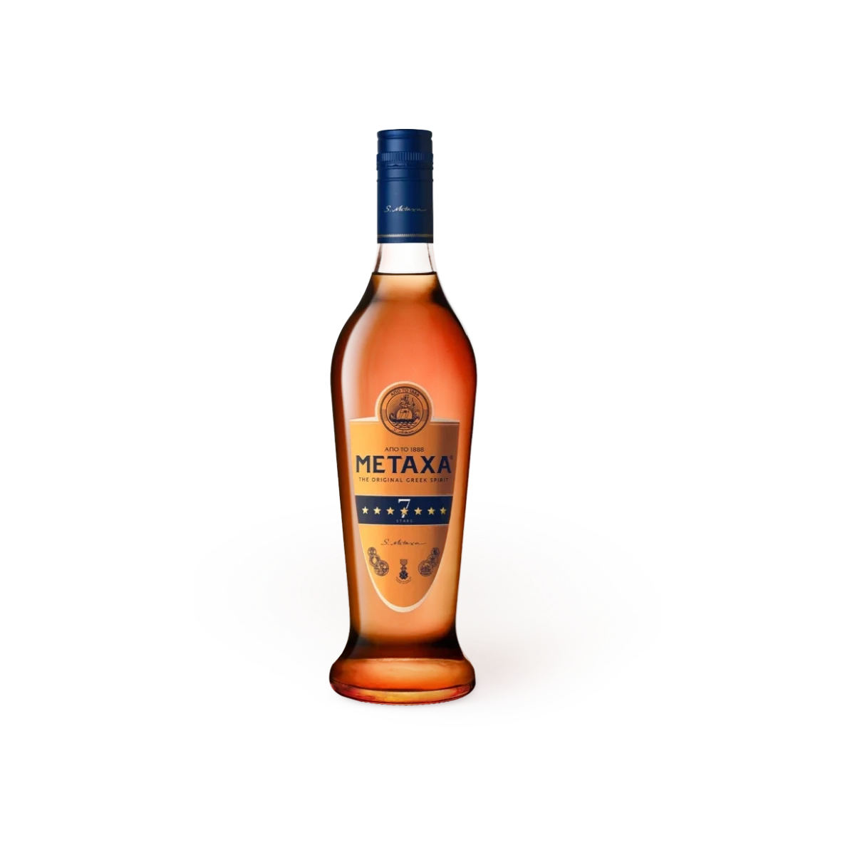 Ποικιλιακή σύνθεση: 40%. Περιοχή: Ελλάδα. Γευστικά χαρακτηριστικά: Το Μetaxa 7* δημιουργείται από αποστάγματα παλαιότερα των 7 ετών. Αυτό το πολυβραβευμένο προϊόν. που φιλοξενείται σ’ένα μπουκάλι σε σχήμα αρχαίου αμφορέα. προτιμάται ιδιαίτερα από τις διεθνείς αγορές. Στη μεστή. καπνιστή γεύση του αντανακλάται η φροντίδα και το πάθος με τα οποία έχει φτιαχθεί. ενώ στο λεπτό άρωμά του υπάρχουν νότες από μοσχάτο κρασί.